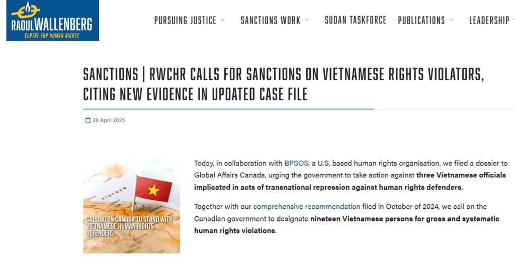 Ngày 28/4/2025 vừa qua, Trung tâm Nhân quyền Raoul Wallenberg (Raoul Wallenberg Centre for Human Rights), với sự hợp tác của BPSOS, đã nộp hồ sơ lên Bộ Ngoại giao Canada đề nghị chế tài thêm ba quan chức Việt Nam có liên quan tới các hành vi đàn áp xuyên quốc gia đối với những người bảo vệ nhân quyền.