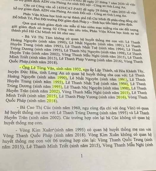 Chưa hết, Tháng Một 2022, vào thời điểm cơ quan điều tra tỉnh Long An khởi tố, bắt giữ các thành viên của Thiền Am, thì một phần văn bản kết luận có liên quan đến việc xét nghiệm DNA (ảnh dưới) đã được tung ra một cách chủ ý, tràn ngập không gian mạng để chuẩn bị dư luận.