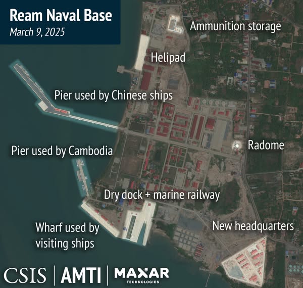 LGT của tác giả: Căn cứ hải quân Ream của Campuchia sát đảo Phú Quốc của Việt Nam (cách khoảng 28 km) là điều rất đáng lo và phải dè chừng. Bài của AMTI (Sáng kiến Minh bạch Biển châu Á) cho thấy Tàu Cộng có vẻ vẫn nắm giữ độc quyền ở đó.