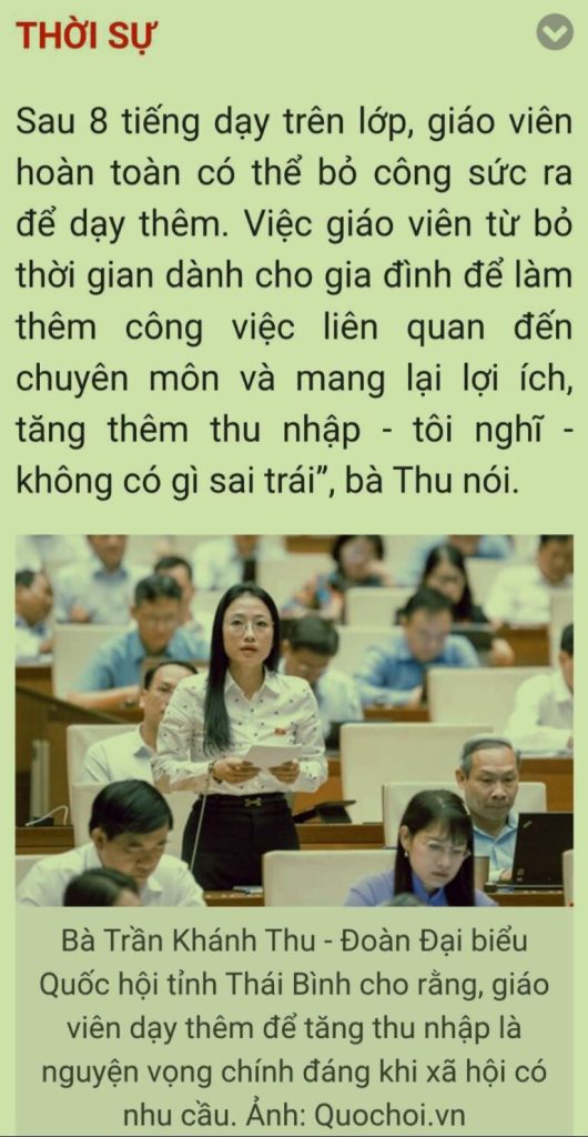 4. Bà có bao giờ suy nghĩ để tự hỏi rằng: Tại sao không thay vì khăng khăng biện minh để đòi giữ một “nền giáo dục dạy thêm” thì cần có một nền giáo dục đảm bảo chất lượng ngay trong chính khóa?