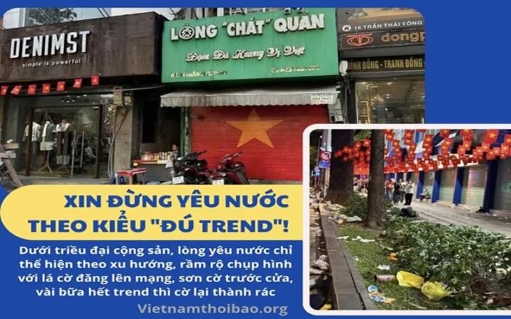 Dưới triều đại cộng sản, lòng yêu nước chỉ thể hiện theo xu hướng, rầm rộ chụp hình với lá cờ đăng lên mạng, sơn cờ trước cửa, vài bữa hết trend thì cờ lại thành rác