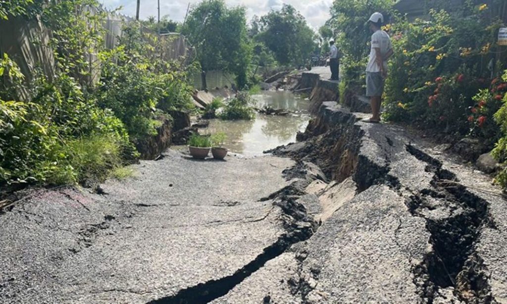 Đoạn sạt lở dài gần 50 mét, ăn sâu vào đất liền 4-5 mét, sụp gần như toàn bộ mặt đường với độ sâu 0.5-2 mét, chia cắt việc đi lại của người dân địa phương qua khu vực, có điểm sát vào tường rào nhà dân.