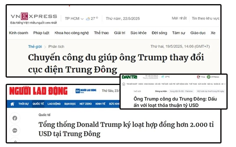 Trong tuần qua nhiều tờ báo VN tổng hợp, trích đăng từ báo nước ngoài những lời lẽ, hình ảnh tô vẽ có lợi cho Trump, TT Mỹ, khi công du Trung Đông, nghe thoang thoảng có mùi tự do đâu đây khi Ban Tuyên giáo Trung ương nới lỏng báo chí cho phép ca ngợi trùm tư bản bóc lột đang là Tổng thống Mỹ. Ban Tuyên giáo Trung ương, kẻ nắm họng toàn bộ báo chí chính thống Việt Nam không có truyền thống cho tay chân của họ viết tử tế về những “tên đầu sỏ đế quốc” – trừ khi… có một biến chuyển rất có lợi đang (hoặc sắp) xảy ra trong hậu trường.
