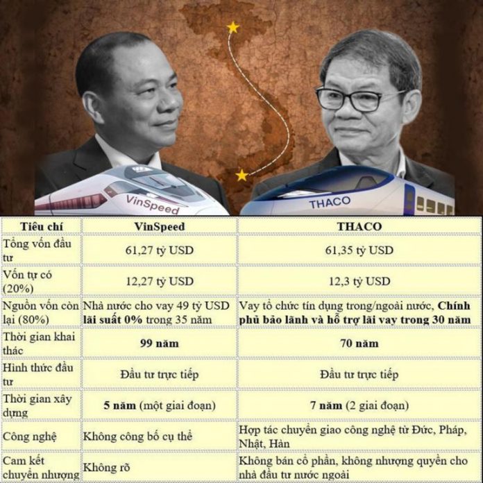 Trước Thaco, VinSpeed cũng thể hiện mong muốn tham gia đầu tư dự án đường sắt tốc độ cao Bắc – Nam. Trong đó, VinSpeed đề xuất đầu tư dự án này theo hình thức đầu tư trực tiếp, thay vì vốn công hay PPP. Doanh nghiệp cũng cam kết tự thu xếp 20% vốn, tương đương 12,27 tỷ USD (không gồm chi phí giải phóng mặt bằng), phần còn lại đề nghị Nhà nước cho vay 49 tỷ USD không lãi suất trong 35 năm. Công ty cũng đề xuất Nhà nước lo công tác giải phóng mặt bằng và cam kết đưa dự án vào vận hành sau 5 năm thi công.