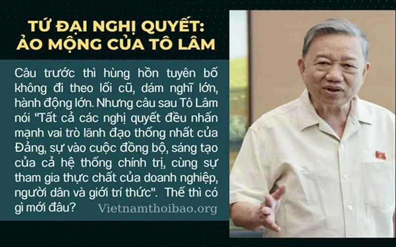 Nhìn vào thời gian ban hành bốn Nghị quyết này thì đều là khi Tô Lâm đã ổn định ngai vị Tổng Bí thư CSVN. Nói thẳng ra là do phe Tô Lâm tự biên soạn và chỉ đạo Bộ Chính trị phải thông qua, ban hành; sau đó bắt buộc Quốc hội phải đi theo. Rồi cuối cùng thì Tô Lâm tự ca ngợi bốn Nghị quyết của mình là đúng đắn, hay ho. Đây chính xác là trò “mèo khen mèo dài đuôi” thường thấy của các lãnh tụ độc tài.