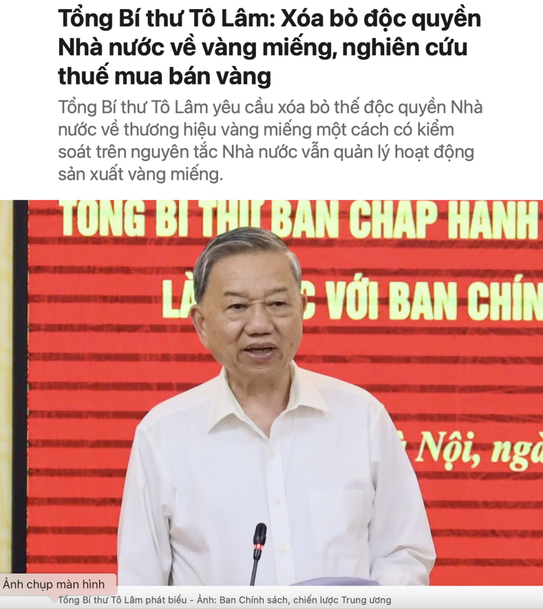Hôm qua 28.5.25, người giữ ngôi vị cao nhất nước là Tổng bí thư Tô Lâm đã có lời lẽ gay gắt về… vàng. Ông yêu cầu/chỉ đạo phải xóa ngay sự độc quyền nhà nước về sản xuất vàng miếng, cụ thể là thương hiệu SJC một mình một chợ, tự tung tự tác gần chục năm nay trong chính cái ô che của nhà nước.