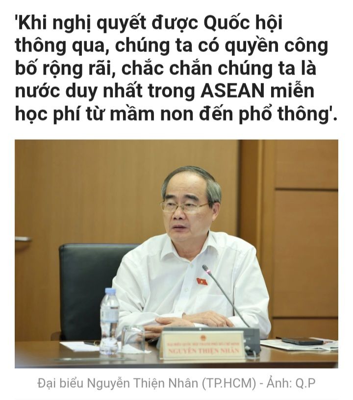 Về hưu, hết chức quyền trong Đảng và Chính phủ nhưng ông Nguyễn Thiện Nhân vẫn đang là Đại biểu Quốc hội khóa khóa XV nhiệm kỳ 2021-2026. Từng lừng danh thế mà lâu ngày chẳng ai nhắc đến nên ông Nguyễn Thiện Nhân mới phải lên tiếng ca ngợi Giáo dục Việt Nam: “Khi nghị quyết được Quốc Hội thông qua, chúng ta có quyền công bố rộng rãi, chắc chắn chúng ta là nước duy nhất trong ASEAN miễn học phí từ mầm non đến phổ thông”.