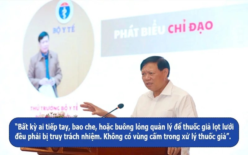 Nói về vấn đề thuốc giả trên thị trường, tại hội thảo “Thuốc giả – hệ luỵ thật: Giải pháp nào để ngăn chặn?” tổ chức ngày 26-5-2025 tại Thành Hồ, Thứ trưởng Bộ Y tế Đỗ Xuân Tuyên đã khẳng định: “Bất kỳ ai tiếp tay, bao che, hoặc buông lỏng quản lý để thuốc giả lọt lưới đều phải bị truy trách nhiệm. Không có vùng cấm trong xử lý thuốc giả”.