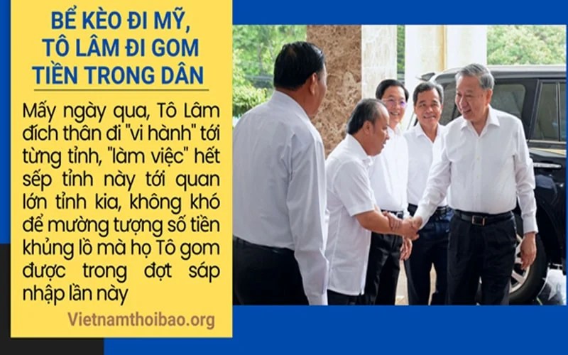 Đó là nói về gom tiền để nuôi cả hệ thống chính trị. Còn riêng Tô Lâm thì lại gom tiền theo kiểu khác. Với chiêu bài tinh gọn, sắp xếp lại bộ máy, Tô Lâm có thể dễ dàng “đấu giá” các vị trí lãnh đạo từ trung ương tới khắp các tỉnh thành. Ghế thì ít, đít thì nhiều, ai muốn ở lại thì phải đưa ra một cái giá cao để được tổng bí thư duyệt. Chỉ trong mấy ngày đầu tháng 6, Tô Lâm đã dạo một vòng quanh các tỉnh sắp sáp nhập ở phía Nam để “mang tiền về cho vợ”.