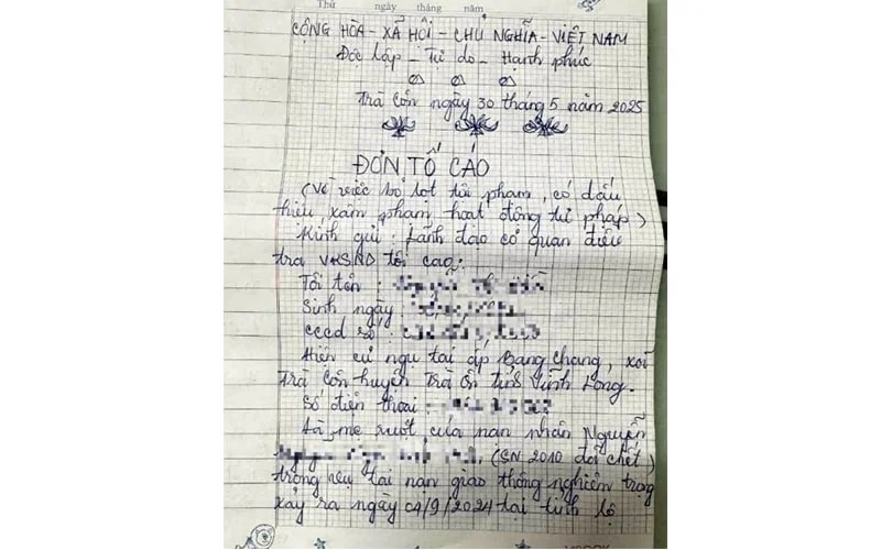 Theo lá đơn được viết nắn nót từng chữ, bà Nguyễn Thị Hiền tố cáo đích danh những cán bộ công an, VKSND ở địa phương vì cho rằng có dấu hiệu xâm phạm hoạt động tư pháp, bỏ lọt tội phạm, không truy tố người có tội trong tiến trình điều tra, giải quyết vụ tai nạn giao thông xảy ra ngày 4/9/2024 khiến bé Trân, con của bà, tử vong.