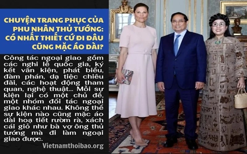 Thế nhưng không phải ai mặc áo dài cũng đẹp và phù hợp, đồng thời, không phải cứ gom hết những hoạ tiết về trống đồng, chim lạc lên áo dài là đẹp. Có lẽ mới tập tành tháp tùng phu quân, nên các bà chưa rành về phong thái làm ngoại giao, chưa tìm hiểu văn hoá ăn mặc Tây phương như thế nào cho sang trọng, hợp thời. Bộ trang phục của phu nhân ông thủ tướng tuy đắt tiền, được dệt thủ công, nhưng cũng không nâng tầm nét đẹp của bà, ngược lại còn gây cảm giác lạc nhịp khi đứng cùng ông chồng đang mặc đồ tây.