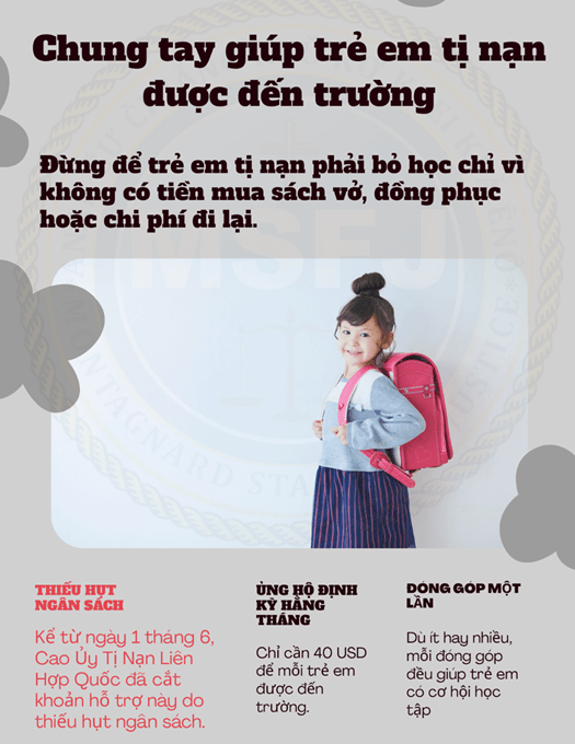 Chúng tôi kêu gọi quý đồng hương ở hải ngoại, nhất là những ai đã từng trải nghiệm thân phận tị nạn ở Thái Lan trong 10 – 15 năm qua, lên tiếng củng với chúng tôi và tiếp tay bảo trợ 40 Mỹ kim / tháng cho một trẻ em được cắp sách đến trường.