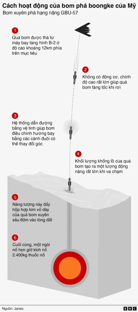 Các quan chức cấp cao của Bộ Quốc phòng cũng xác nhận rằng bom GBU-57A, một loại bom “phá boongke”, đã được sử dụng trong cuộc tấn công, với hai quả bom được triển khai cho mỗi mục tiêu hạt nhân.