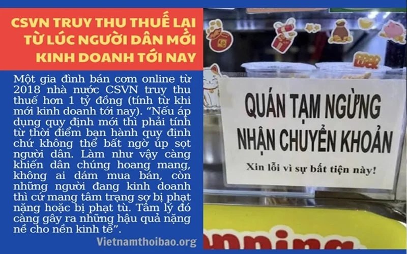 Một gia đình bán cơm online từ 2018 bị nhà nước CSVN truy thu thuế hơn 1 tỷ đồng (tính từ khi mới kinh doanh tới nay) khiến dư luận tỏ ra bất ngờ. Theo đó một người dân ở Nam Định đã gửi câu hỏi về trường hợp của mình để mong được Cục Thuế (Bộ Tài chính) trả lời. Đây không phải tin đồn mà là sự thật được báo chí CSVN đưa tin.