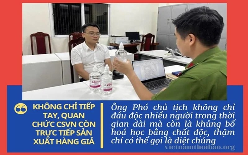 Quay lại chuyện Phó chủ tịch bán cồn giả. Báo chí CSVN loan tin ông này đã thay đổi nguyên liệu sản xuất cồn từ ethanol sang methanol 99 độ (cồn công nghiệp) trộn với nước lọc RO rồi đóng vào chai, dán tem cồn y tế để bán ra thị trường. Thông tin ban đầu, công an đã thu giữ 35.567 chai cồn, trị giá khoảng 382 triệu đồng. Tất cả đều không chứa chất ethanol như công bố trên nhãn hàng hóa mà chỉ chứa methanol.