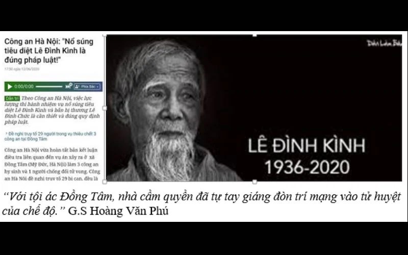 “Trong các cuộc đột kích, ông trưởng thôn 85 tuổi Lê Đình Kình đã bị giết khi công an xông vào nhà ông khi ông và gia đình đang ngủ. Ông Lê Đình Kình bị giữ ở nhà trong khi gia đình ông bị bắt đi và bị đánh đập. Khi họ trở lại thì phát hiện ông đã bị giết. Nhà chức trách cho rằng ông Lê Đình Kình dùng lựu đạn đe dọa công an. Ba sĩ quan cảnh sát được cho là đã thiệt mạng trong cuộc đột kích. Chính quyền nói rằng họ đã bị dân làng địa phương tấn công và đốt cháy. Tuy nhiên toàn cảnh về cái chết của ba công an này vẫn chưa rõ ràng.” (13)