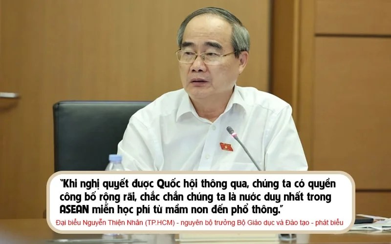 Cũng liên quan đến vấn đề này, phát biểu tại phiên thảo luận tổ được báo chí ghi nhận vào tháng 5 năm nay, về các dự thảo nghị quyết về miễn học phí, hỗ trợ học phí đối với trẻ em mầm non, học sinh phổ thông, người học chương trình giáo dục phổ thông tại các cơ sở giáo dục trong hệ thống giáo dục quốc dân; phổ cập giáo dục mầm non cho trẻ em mẫu giáo từ 3 đến 5 tuổi, theo Đại biểu Nguyễn Thiện Nhân (Thành phố Hồ Chí Minh) – nguyên bộ trưởng Bộ Giáo dục và Đào tạo thì: “Khi nghị quyết được Quốc hội thông qua, chúng ta có quyền công bố rộng rãi, chắc chắn chúng ta là nước duy nhất trong ASEAN miễn học phí từ mầm non đến phổ thông”.