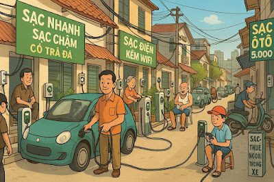 Khắp phố khắp làng, nhà nào cũng lắp một cái ổ sạc ngay… mặt tiền. Biển hiệu “Sạc nhanh – Sạc chậm – Sạc thuê – Có trà đá” mọc lên san sát như quán trà đá ngày xưa. Người đi đường không còn dừng lại vì tắc đường, mà dừng lại vì… thấy ổ sạc trống.