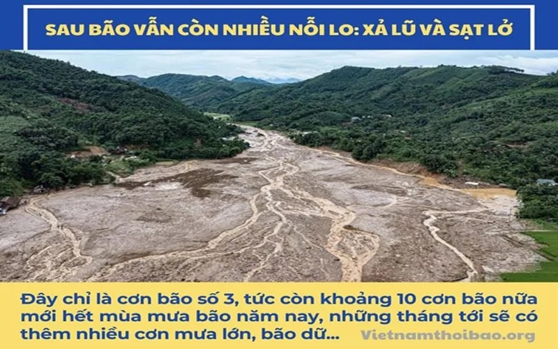 Tuy nhiên, ở Việt Nam những năm gần đây thì có hai vấn đề lớn hơn sau bão là thuỷ điện xả lũ và sạt lở. Một vấn nạn mà ai cũng biết là CSVN có thói quen “tích nước mùa khô và xả lũ mùa mưa”, mùa khô thì các đập thủy điện tích nước, bỏ mặc cho người dân ở hạ lưu thiếu nước, cây cối hoa màu chết khô. Còn mùa mưa thì xả lũ bất thình lình, không hề có chuyện “điều tiết” như trên lý thuyết. Thiệt hại nhân mạng, tài sản của người dân phần lớn từ những vụ “nhân tai” xả lũ này mà ra, chứ không phải từ giông bão.