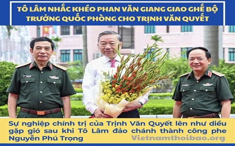 Quả thật, sự nghiệp chính trị của Trịnh Văn Quyết lên như diều gặp gió sau khi Tô Lâm đảo chánh thành công phe Nguyễn Phú Trọng. Ngày 22/5 năm ngoái Tô Lâm lên Chủ tịch nước, thì ngày 3/6 Trịnh Văn Quyết lên Chủ nhiệm Tổng cục Chính trị. Ngày 3/8 Tô Lâm chính thức nắm quyền Tổng Bí thư, thì ngày 16/8 Trịnh Văn Quyết được “bầu” vào Ban Bí thư Trung ương Đảng CSVN.