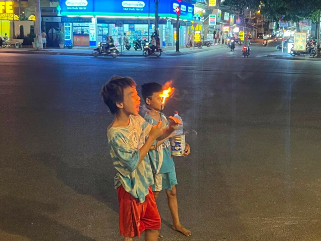 Một ngọn lửa bùng lên, trên con đường sầm uất ở Quận 8, Saigon, rồi tắt ngấm, từ miệng của em bé trạc tầm 10 tuổi, phía trước quán nhậu dày đặc khách, vào đêm cuối tuần. Nhưng có lẽ, tôi là người hiếm hoi chú ý đến em, vì tôi là vị khách không nhậu trong quán, tối hôm ấy. Thành thử, tôi có thời gian lặng lẽ quan sát em.
