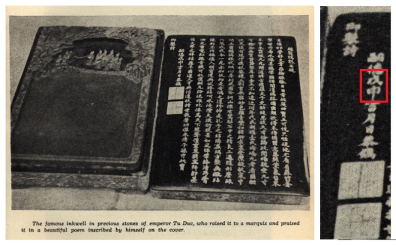 Nghiên mực của vua Tự Đức. Trên nắp đề bài thơ bằng chữ Hán (Nghiên mực nổi tiếng bằng đá quý của vua Tự Đức, được vua phong hầu và khắc bài thơ trên nắp. (chuyển ngữ dòng chú thích dưới ảnh). Nguồn/Ảnh: Bạn đọc Nguyễn Duy Chính gởi tác giả và chú thích: Vietnamese Realities, Bộ Ngoai Giao VNCH (Ministry of Foreign Affairs, Republic of Vietnam), Sài Gòn, 1967, trang 89. Đây là ảnh của ông Thái Văn Kiểm trong cuốn Vietnam d’Hier et d’Aujourd’hui, Editions Intern., Tanger, 1956. Tấm ảnh này đã đăng trong Văn Hóa Nguyệt San (trước 1963).
