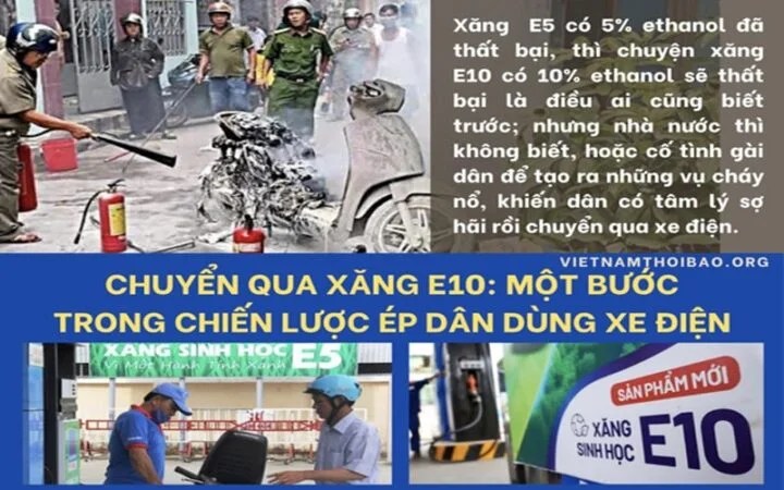 Xăng E5 có 5% ethanol đã thất bại, thì chuyện xăng E10 có 10% ethanol sẽ thất bại là điều ai cũng biết trước; nhưng nhà nước thì không biết, hoặc cố tình gài dân để tạo ra những vụ cháy nổ, khiến dân có tâm lý sợ hãi rồi chuyển qua xe điện