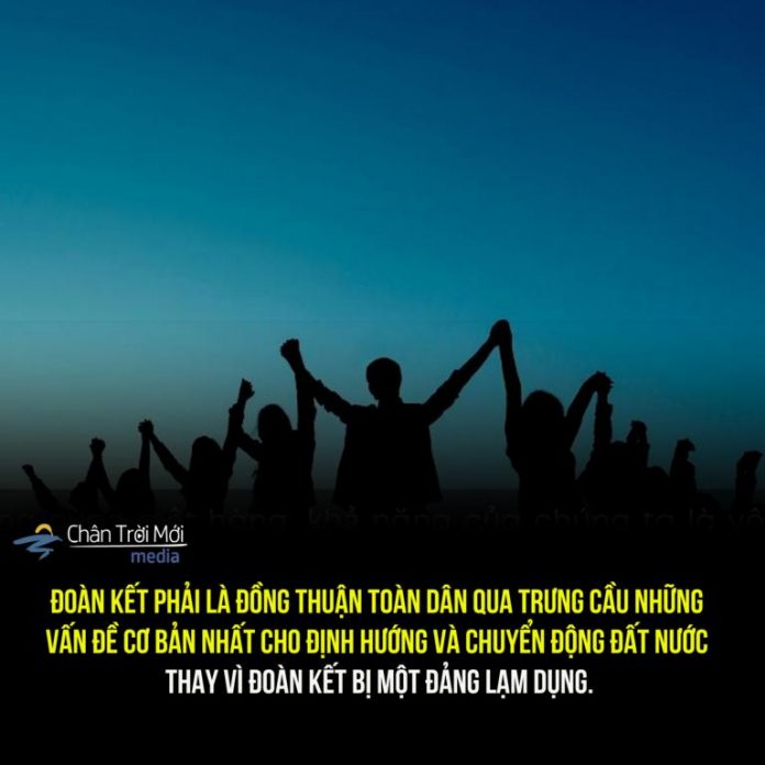 Đoàn kết vì quốc gia thì pháp luật cần được mọi thành phần chấp nhận và cam kết thực hiện; không bằng tuyên truyền ‘gắn bó’ rồi cố công ‘gắn’ và ‘bó’ các thực thể mâu thuẫn vào nhau. Đoàn kết phải là đồng thuận toàn dân qua trưng cầu những vấn đề cơ bản nhất cho định hướng và chuyển động đất nước: thể chế và đường lối, thành phần và nguồn lực phát triển, dân có quyền chọn lựa lãnh đạo, lãnh đạo không có quyền bắt buộc áp đặt mới được làm; cá nhân và tổ chức xã hội, kể cả tổ chức đảng và đảng viên, đều tuân thủ luật. Đồng thuận như vậy sẽ khởi đầu đoàn kết toàn dân, thay vì đoàn kết bị một đảng lạm dụng./.