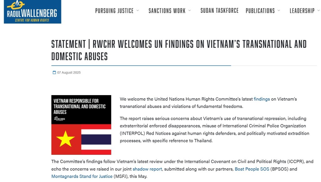 “Báo cáo nêu lên những quan ngại nghiêm trọng về các hình thức đàn áp xuyên quốc gia của Việt Nam, như cưỡng bức mất tích ngoài lãnh thổ, lạm dụng Lệnh Truy nã Đỏ của Cảnh sát Quốc tế (Interpol) cho người đấu tranh nhân quyền, và yêu cầu dẫn độ với động cơ chính trị, đặc biệt ở Thái Lan.