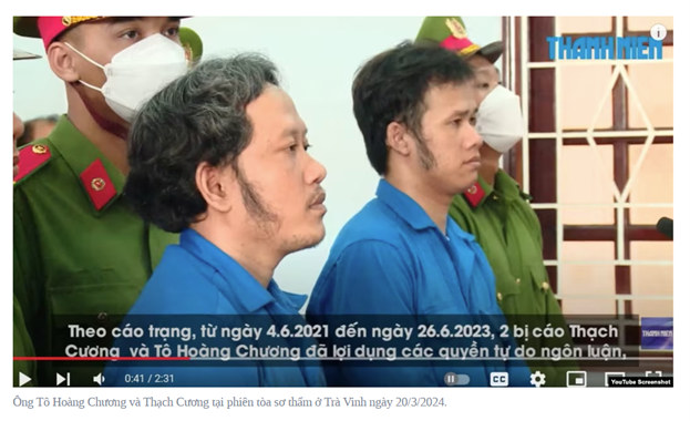 Ngày 31 tháng 7, 2023, công an tỉnh Trà Vinh bắt hai Ông Tô Hoàng Chương và Thạch Cương với cáo buộc “lợi dụng các quyền tự do dân chủ xâm phạm lợi ích của Nhà nước, quyền, lợi ích hợp pháp của tổ chức, cá nhân” — Điều 331 Bộ Luật Hình Sự. Hai người này, thuộc dân tộc bản địa Khmer Krom theo Phật Giáo Tiểu Thừa, từng tranh đấu cho quyền người bản địa và quyền tự do tôn giáo của người Khmer Krom. Ngày 20 tháng 3, 2024, Toà Án Nhân Dân Huyện Cầu Ngang xử Ông Cương 4 năm tù vằ ông Chương 3,5 năm tù. Ngày 23 tháng 5, 2024 Toà Án Nhân Dân Tỉnh Trà Vinh tuyên y án trong phiên xử phúc thẩm.