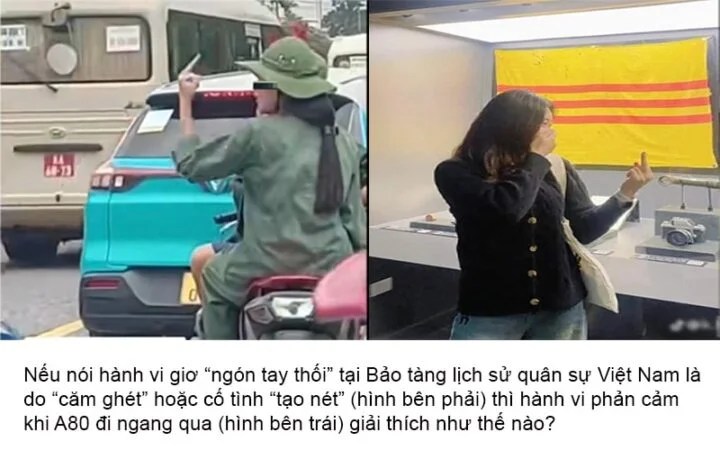 Nếu nói hành vi giơ “ngón tay thối” tại Bảo tàng lịch sử quân sự Việt Nam là do “căm ghét” hoặc cố tình “tạo nét” thì hành vi phản cảm khi A80 đi ngang qua, giải thích như thế nào? Có đúng là do cảm xúc hay hành động của cá nhân (hoặc một nhóm) hay nguyên nhân sâu xa, là do từ giáo dục?