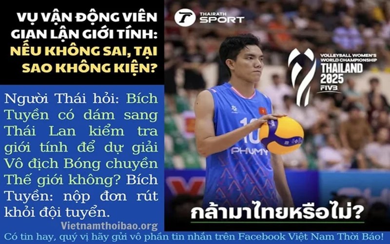 Người Thái hỏi: Bích Tuyền có dám sang Thái Lan kiểm tra giới tính để dự giải Vô địch Bóng chuyền Thế giới không? Bích Tuyền: nộp đơn rút khỏi đội tuyển.