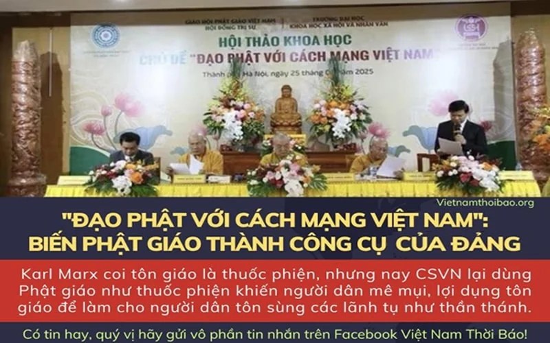 Trung ương Giáo hội Phật giáo Việt Nam (trụ sở chùa Quán Sứ) vừa tổ chức Hội thảo Khoa học “Đạo Phật với Cách mạng Việt Nam” dịp kỷ niệm 80 năm Cách mạng Tháng Tám và Quốc khánh. Ngay khi vừa nghe qua cái tên “Hội thảo khoa học Đạo Phật với cách mạng Việt Nam”, thì đã thấy có vấn đề, bởi các nhà “cách mạng” cộng sản vốn theo chủ nghĩa duy vật, còn tôn giáo là duy tâm. Như Karl Marx, ông tổ của chủ nghĩa cộng sản, từng cho rằng “tôn giáo là liều thuốc phiện của nhân dân”.