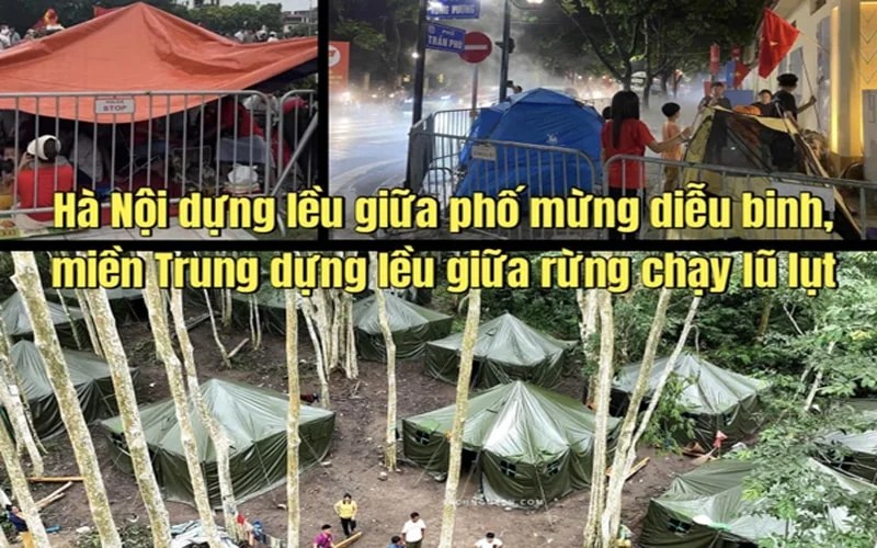 Ở Hà Nội, một tuần qua, người ta cũng dựng lều dựng trại, không phải vì thiên tai, mà để ăn mừng ngày Quốc khánh, chào đón quân đội diễu binh. Nhìn thì giống lắm, Hà Nội cũng dựng bạt dựng lều tạm, cũng được phát lương khô, bánh trái, nước uống miễn phí. Nghệ An cũng vậy. Nhưng một nơi dựng lều chạy lũ, một nơi dựng trại ăn mừng.
