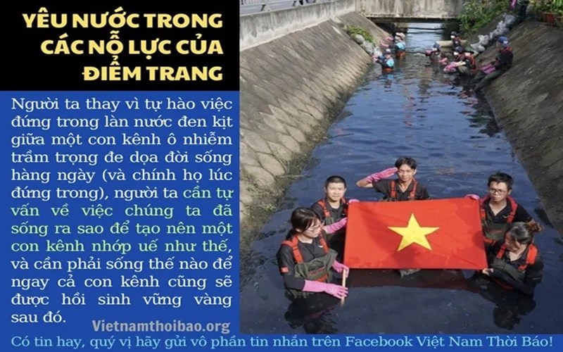 Họ ngày càng tầm thường hoá và kéo tuột xuống lòng yêu nước một cách thảm hại khi gắng trưng dụng mọi góc chụp cận cảnh để trưng diện lòng yêu nước chưa biết cách nào định hình được chúng. Người ta thay vì tự hào việc đứng trong làn nước đen kịt giữa một con kênh ô nhiễm trầm trọng đe dọa đời sống hàng ngày (và chính họ lúc đứng trong), người ta cần tự vấn về việc chúng ta đã sống ra sao để tạo nên một con kênh nhớp uế như thế, và cần phải sống thế nào để ngay cả con kênh cũng sẽ được hồi sinh vững vàng sau đó.