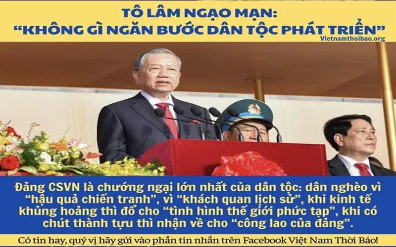 Trong diễn văn ngày 2/9, Tổng Bí thư CSVN Tô Lâm liên tục ca ngợi “ơn đảng, ơn nhà nước”. Đồng thời nhấn mạnh “mọi thắng lợi của cách mạng Việt Nam đều gắn liền với vai trò lãnh đạo đúng đắn, sáng suốt của Đảng và tư tưởng, đạo đức, phong cách Hồ Chí Minh”. Cùng với đó là lời khẳng định hùng hồn: “không có mục tiêu cao đẹp nào mà dân tộc ta không đạt tới, không có lực cản nào, không có lý do gì có thể ngăn bước chúng ta vươn tới hòa bình, thịnh vượng, dân tộc ta trường tồn và phát triển”.