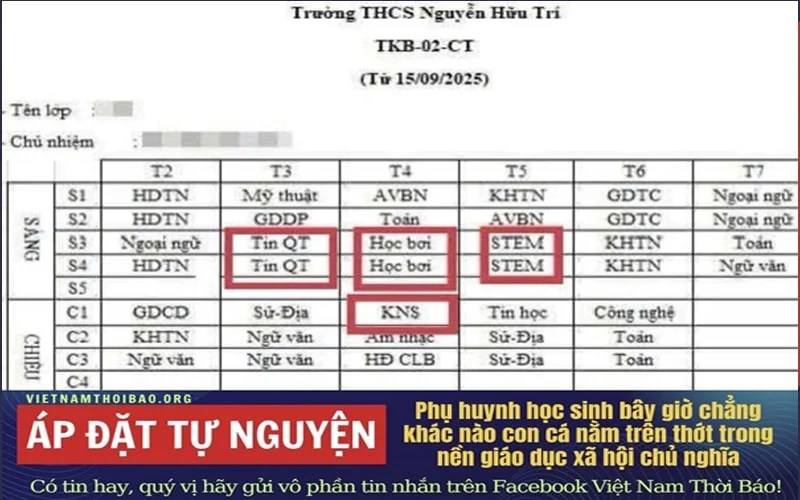 Các môn học do trường này tự đưa vào giờ học chính khoá gồm tin học quốc tế, Anh văn bản ngữ, STEM, Kỹ năng sống. Tổng cộng lên tới 9 tiết mỗi tuần. Như vậy chính sách miễn học phí của CSVN cũng chỉ là trò đánh lận con đen. Không thu tiền học chính khoá mà cài cắm các môn tự nguyện vào để thu tiền một cách ép buộc cực kỳ tinh vi. Khi môn tự nguyện được đặt giữa các môn chính khóa, học sinh nào đủ khả năng… bỏ tiết? Phụ huynh nào đủ can đảm yêu cầu con mình ngồi chơi giữa giờ khi cả lớp đang học? Thế nên “tự nguyện” chỉ tồn tại trên giấy tờ, còn trên thực tế là cưỡng ép trá hình.