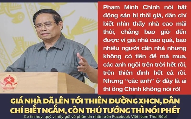 Chiều 22/9, Thủ tướng Phạm Minh Chính – Trưởng Ban chỉ đạo Trung ương về chính sách nhà ở và thị trường bất động sản – chủ trì hội nghị công bố quyết định kiện toàn Ban chỉ đạo và phiên họp thứ nhất của Ban chỉ đạo. Tại đây, ông Chính cao giọng cho rằng “bất động sản bị thổi giá, dân chỉ biết nhìn thấy nhà cao mãi thôi, chẳng bao giờ đến được vì giá nhà cao quá, bao nhiêu người cần nhà nhưng không có tiền để mà mua, các anh ngồi trên trời hết rồi, trên thiên đình hết cả rồi”!