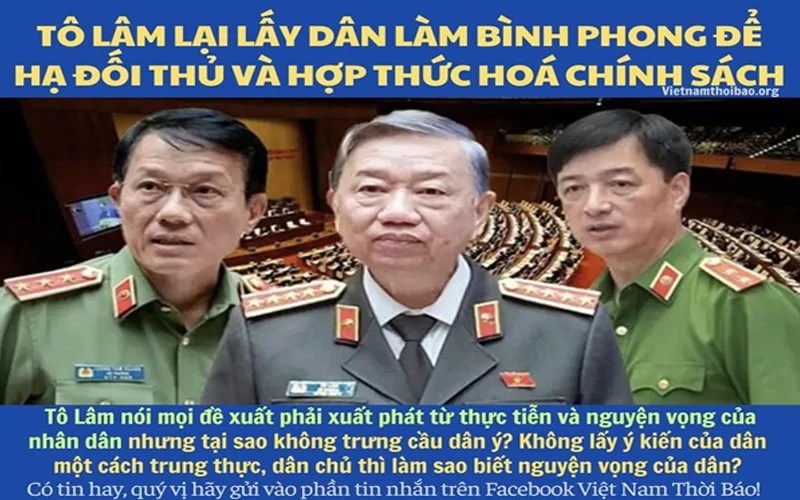 Những lời mị dân này cũng tương tự chuyện “lấy là gốc”, “nhân dân là trung tâm” như cách tuyên truyền lâu nay của CSVN. Tuy nhiên, nếu đối chiếu với thực tế từ năm 2024 đến nay, kể từ khi Tô Lâm chính thức ngồi vào ghế Tổng Bí thư, có thể thấy đây chỉ là một chiêu bài chính trị, lấy dân ra làm bình phong để che đậy quá trình tập trung quyền lực, củng cố phe nhóm. Cùng với đó là việc ban hành những chính sách gom tiền trong dân, bảo vệ chế độ độc tài công an trị, đi ngược lại lợi ích, nguyện vọng thực sự của nhân dân.