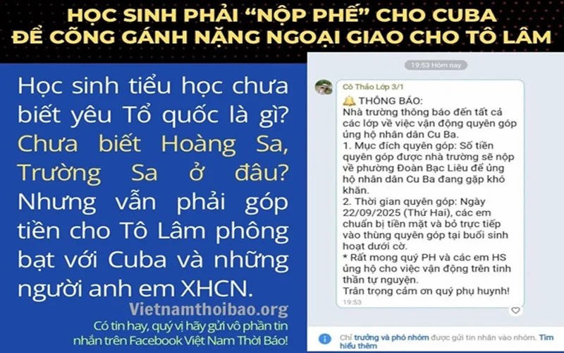 Học sinh tiểu học chưa biết yêu Tổ quốc là gì? Chưa biết Hoàng Sa, Trường Sa ở đâu? Nhưng vẫn phải góp tiền cho Tô Lâm phông bạt với Cuba và những người anh em XHCN