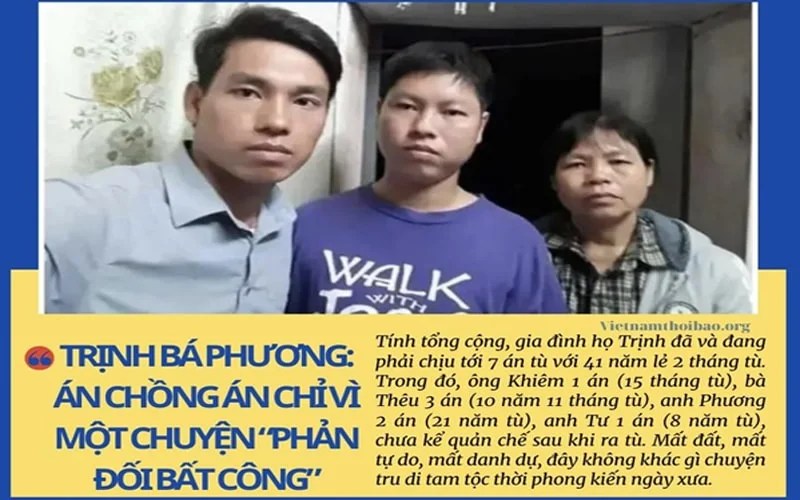 Tính tổng cộng, gia đình họ Trịnh đã và đang phải chịu tới 7 án tù với 41 năm lẻ 2 tháng tù. Trong đó, ông Khiêm 1 án (15 tháng tù), bà Thêu 3 án (10 năm 11 tháng tù), anh Phương 2 án (21 năm tù), anh Tư 1 án (8 năm tù), chưa kể quản chế sau khi ra tù. Mất đất, mất tự do, mất danh dự, đây không khác gì chuyện tru di tam tộc thời phong kiến ngày xưa.