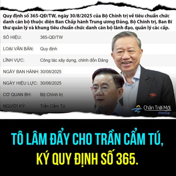 Lần này ông Tô Lâm đẩy cho cấp phó của mình tức ông Trần Cẩm Tú ký. Có lẽ Tô Lâm cảm thấy đây là văn bản hoặc vô dụng hoặc dối trá. Sẽ chẳng có cán bộ nào có đạo đức có tài có bản lĩnh chính trị được chọn, mà thay vào đó là những cán bộ biến chất. Rồi đây trong số những người được chọn sẽ bị phơi mặt lên mặt báo vì sai phạm thì khi đó người ký văn bản này sẽ bị dân lôi ra chửi. Có lẽ Tô Lâm biết điều này xảy ra nên tránh né việc ký Quyết định 365 này.