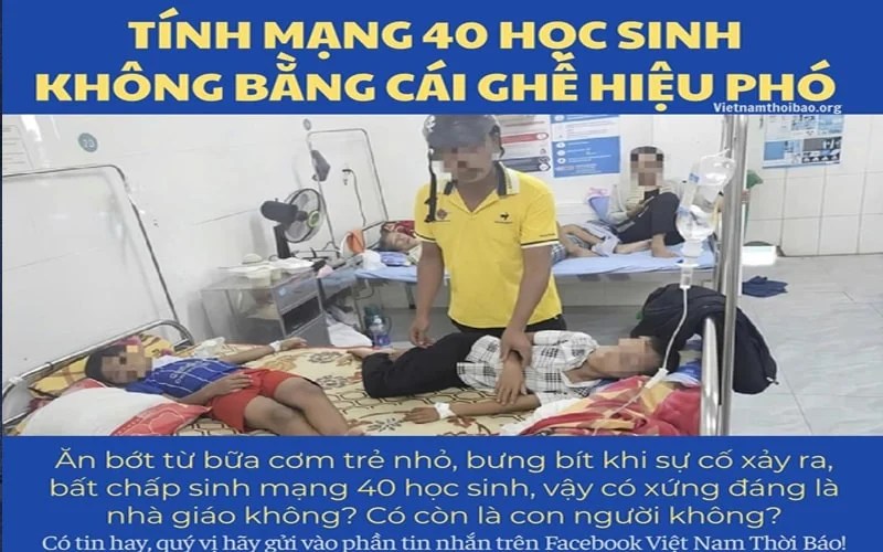 Trong khi trước mặt bà hiệu phó là hơn chục em nhỏ nôn ói, đau bụng, tiêu chảy, những triệu chứng điển hình của ngộ độc thực phẩm. Bà Huế không phải bác sĩ chuyên khoa nhưng vẫn dám khẳng định “100% không sao cả”. Còn theo xác nhận của Bệnh viện Đa khoa Lệ Thủy, 40 học sinh nhập viện với các chỉ số sinh tồn bị ảnh hưởng; nếu không xử lý kịp thời, tình trạng các em có thể trở nên nghiêm trọng. Khi mạng sống của học sinh mong manh như vậy, thái độ “không sao cả” của bà phó hiệu trưởng chẳng khác nào coi rẻ sinh mạng con trẻ.