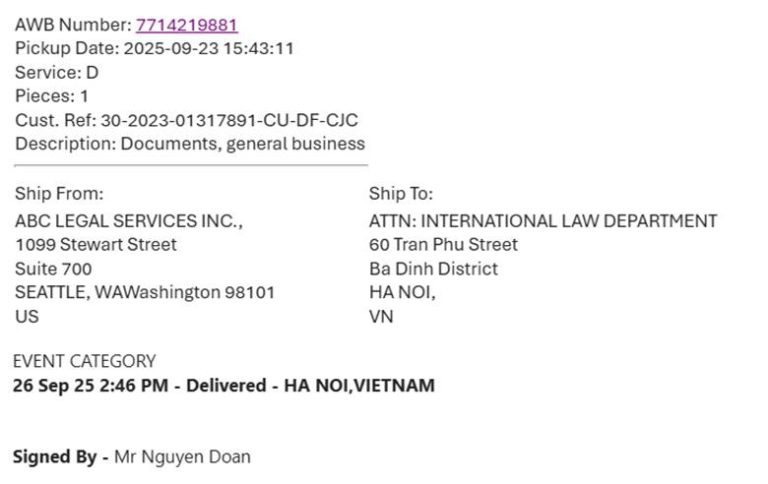 Biên nhận giấy triệu tập tống đạt đến Bộ Tư Pháp Việt Nam