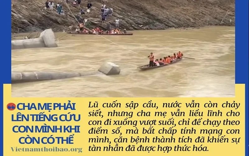 Lũ cuốn sập cầu, nước vẫn còn chảy siết, nhưng cha mẹ vẫn liều lĩnh cho con đi xuồng vượt suối, chỉ để chạy theo điểm số, mà bất chấp tính mạng con mình, căn bệnh thành tích đã khiến sự tàn nhẫn đã được hợp thức hóa.