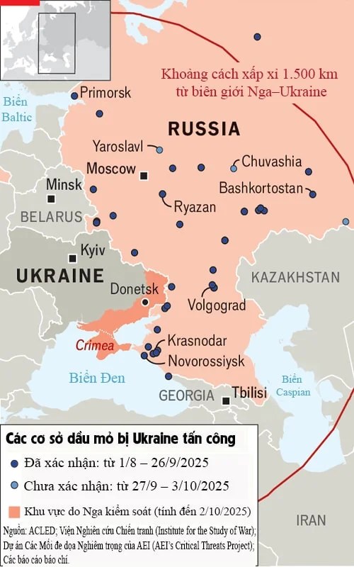 UKRAINE TIẾP TỤC gây ra thiệt hại chết người cho cơ sở hạ tầng năng lượng của Nga, và nhịp độ tấn công ngày càng gia tăng. Các cuộc tấn công bằng máy bay không người lái phối hợp của Ukraine vào các nhà máy lọc dầu và các bộ phận khác của hệ thống phân phối nhiên liệu của Nga bắt đầu vào tháng 8, và số lượng các cuộc tấn công đang tăng từ hai hoặc ba lần một tuần lên bốn hoặc năm lần. Chẳng bao lâu nữa, chúng sẽ xảy ra hàng ngày. Trong khoảng một tuần qua, Ukraine đã gây thiệt hại nặng nề cho một cảng xuất khẩu dầu lớn tại Novorossiysk trên Biển Đen, một tổ hợp nhà máy lọc dầu ở Bashkortostan (cách Ukraine hơn 1.300 km) và một trạm bơm ở Chuvashia, cách đó 1.000 km. Một nhà máy lọc dầu lớn ở Yaroslavl đã bị tấn công vào ngày 1 tháng 10, nhưng phía Nga tuyên bố đây là “vấn đề kỹ thuật”, chứ không phải do một cuộc tấn công bằng máy bay không người lái gây ra. Vào ngày 25 tháng 9, Tổng tư lệnh Ukraine, Tướng Oleksandr Syrsky, khi đề cập đến chiến dịch “DeepStrike” (Tấn công sâu vào hậu phương của địch) rộng lớn hơn đã tấn công 85 mục tiêu “có giá trị cao” trong vòng chưa đầy hai tháng, đã phát biểu: “Năng lực của tổ hợp công nghiệp-quân sự của kẻ thù đã bị suy giảm đáng kể; chúng ta có thể thấy điều này trên chiến trường.”
