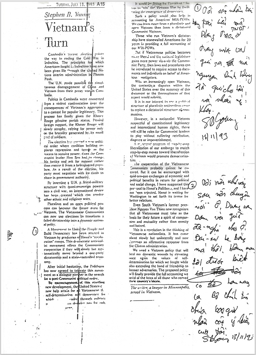 Ảnh chụp bài báo Vietnam’s Turn của GS Stephen Young, đăng trên báo Washington Post ngày 13-7-1993.