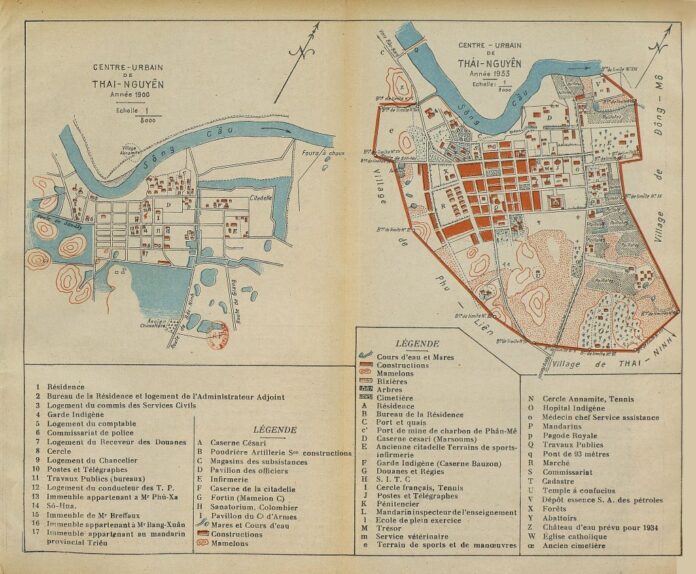 Bản đồ thời Pháp thể hiện đúng như status viết, TP nằm về một bên sông. Phần ô bàn cờ là trung tâm hành chính hiện tại.