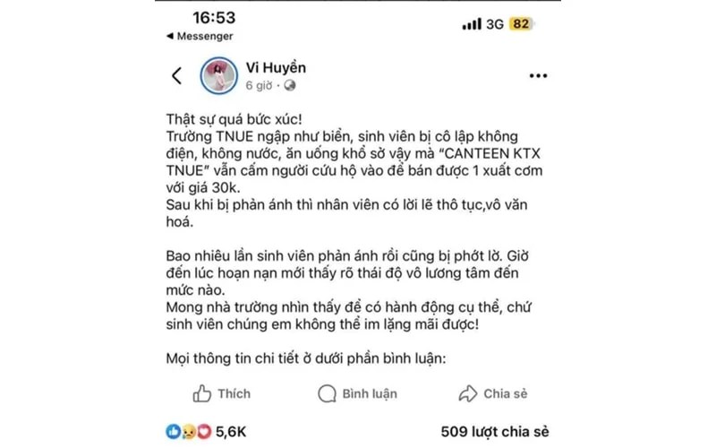 Sinh viên bị cô lập trong lũ, nhà trường cấm cơm từ thiện, ép mua cơm canteen giá cao, trục lợi. Khi bị tố thì trường hù dọa sinh viên xóa bài, trường chối tội.