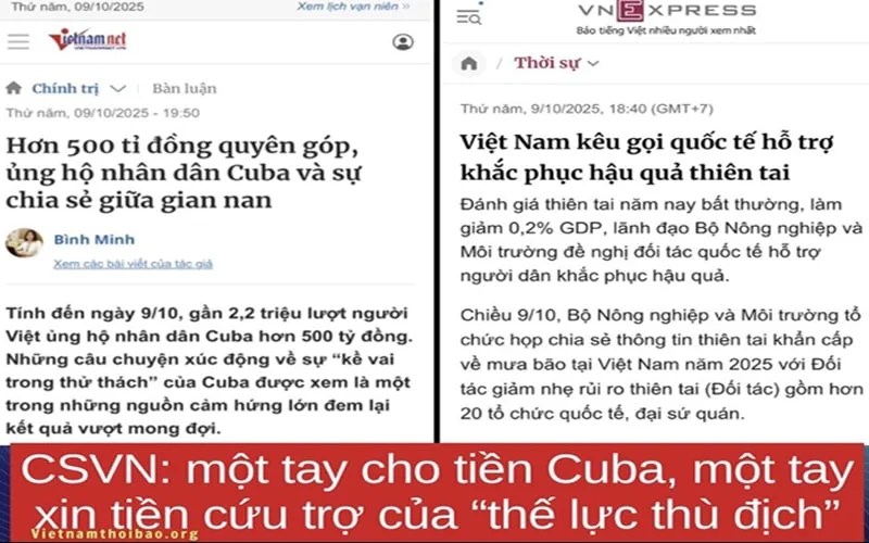 Ngày 9/10, Việt Nam công bố khoản viện trợ trị giá 500 tỷ đồng cho Cuba, được mô tả là “thể hiện tình đoàn kết anh em giữa hai nước xã hội chủ nghĩa”. Nhưng, cũng ngày hôm đó, 9/10, nhà nước CSVN lại kêu gọi cộng đồng quốc tế hỗ trợ khẩn cấp cho các vùng bị ảnh hưởng do bão lũ.